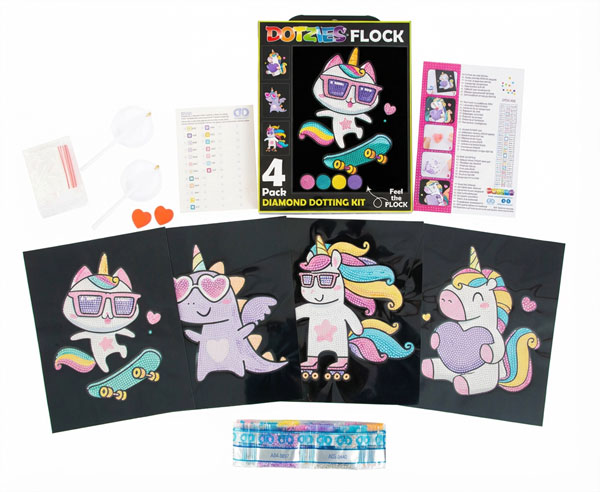 Dotzies Neon Flock settene er utviklet for en enkel og inspirerende start med diamond painting. Hvert sett inneholder 4 ferdigtrykte motivark (20 x 25 cm) med sterke neonfarger på mørk, fløyelsaktig bakgrunn som gir ekstra kontrast og dybde. Settene inneholder selvklebende underlag, Diamond Dotz i 2,7 mm, stylus, brett, voks og instruksjon. Perfekt for nybegynnere eller som et raskt prosjekt med glitrende og profesjonelt resultat.