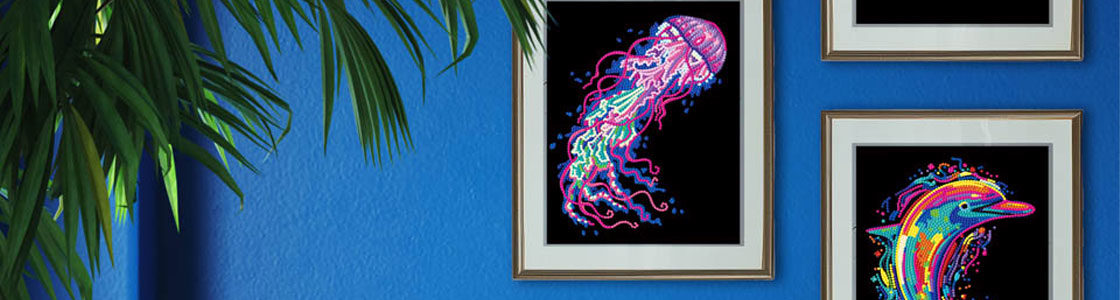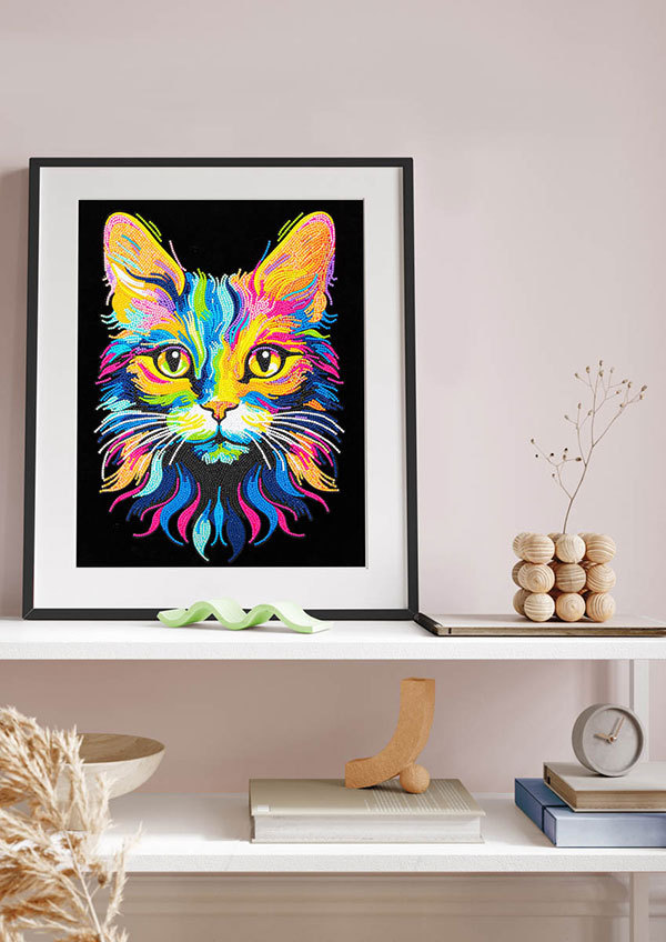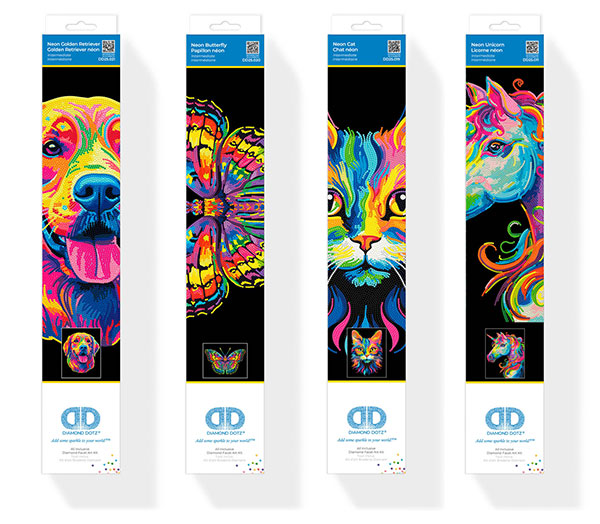 Neon Flock settene passer for de som ønsker mer detaljerte motiv og en mer tidkrevende prosess. Neonfarger kombinert med fløyelsaktig bakgrunn gir sterk kontrast og fremhever detaljene i motivet. Settene inneholder ferdigtrykte motivark med selvklebende underlag, Diamond Dotz i 2,7mm, stylus, brett, voks og instruksjon. Et godt valg for erfarne brukere som ønsker fordypning og et mer avansert og glitrende sluttresultat.