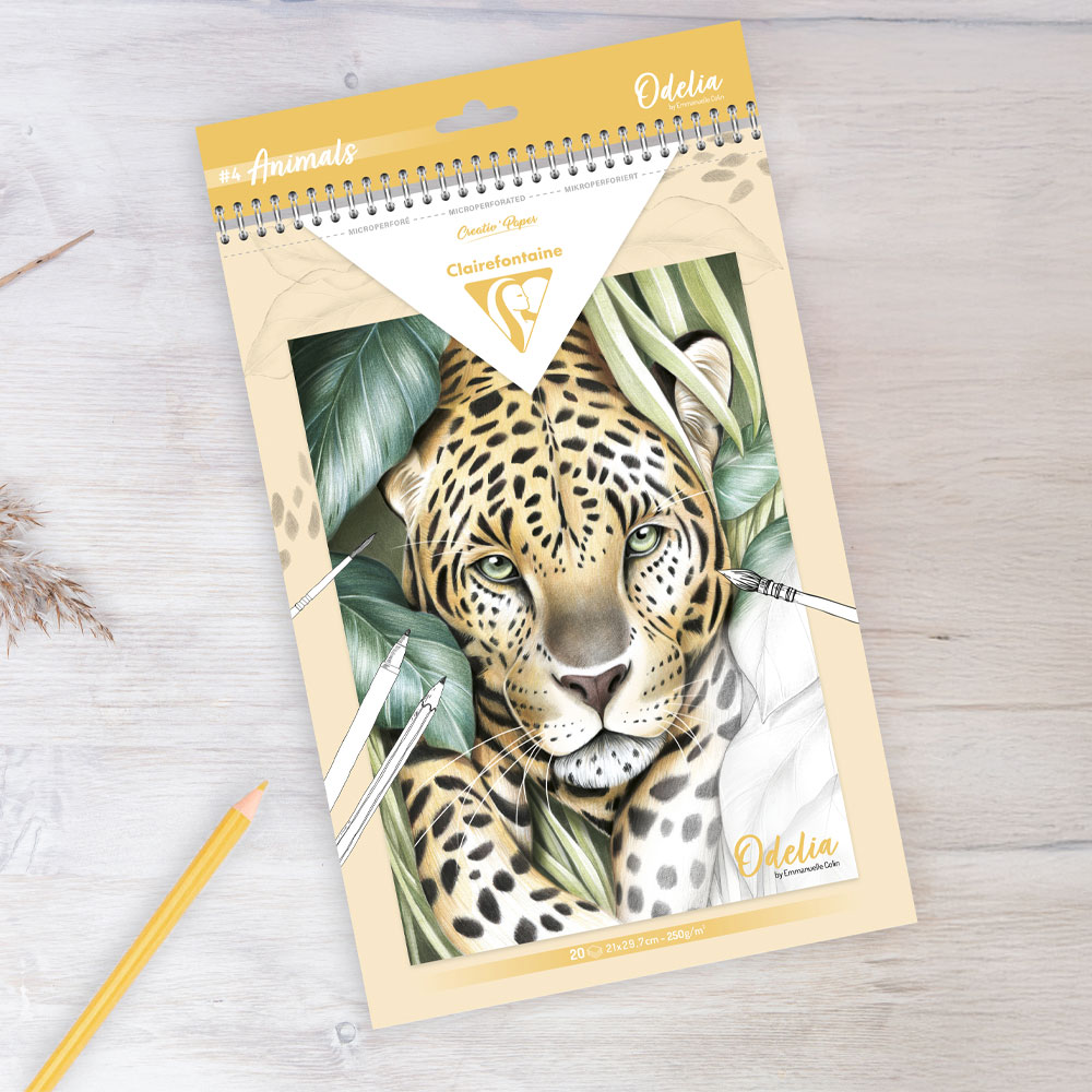 Clairefontaine Odelia er laget for de som liker å eksperimentere med ulike teknikker. Blokken inneholder seks illustrasjoner, gjentatt tre ganger hver, slik at man kan teste ut fargeblyanter, tusj, maling eller akvarell på samme motiv.