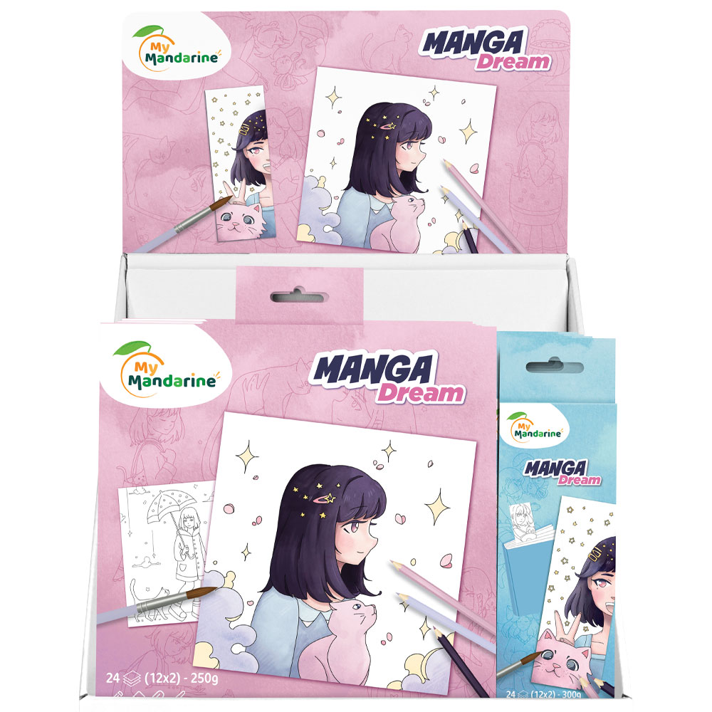 Når manga møter mykhet og poesi, oppstår Manga Dream. Serien er illustrert av Pomelyne og følger en ung jente og katten hennes gjennom stemningsfulle, drømmende øyeblikk fylt med fantasi og varme.