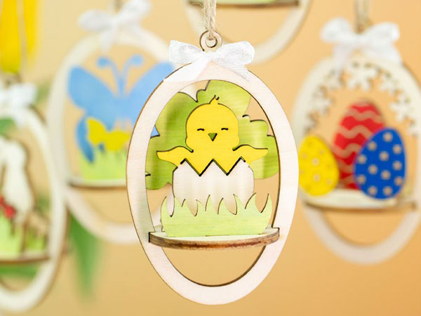 Dekorative påskeegg i tre med utskårne motiver som harer, kyllinger, blomster, sommerfugler og mønstrede egg. Perfekte til oppheng, borddekor eller kreative påskeprosjekter. Kan males, dekoreres eller beholdes i naturlig treutførelse.