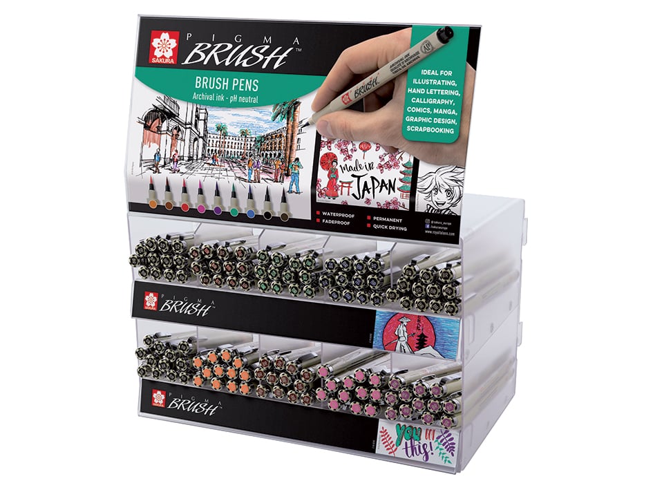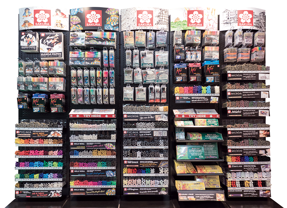 Display med de beste produktene fra Sakura til skissing, tegning, skriving, illustrering med mer!