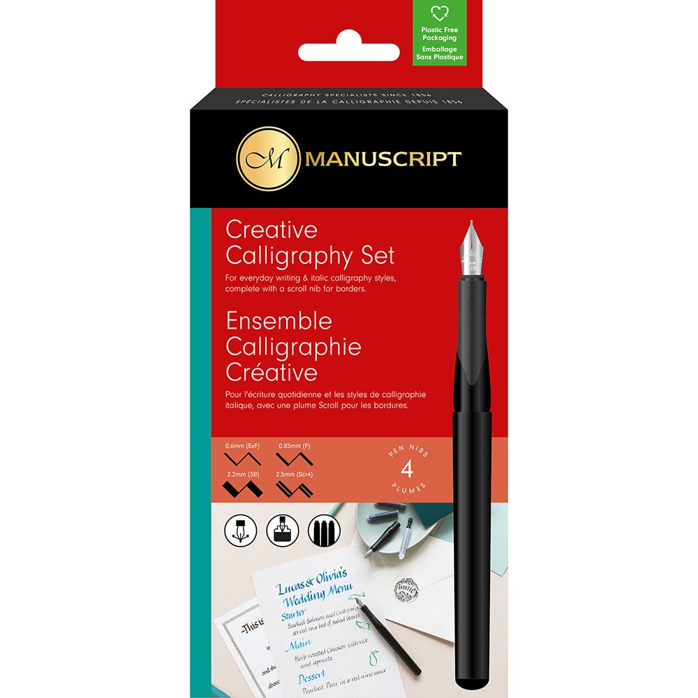 Kalligrafisett i metalleske med lokk