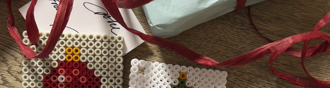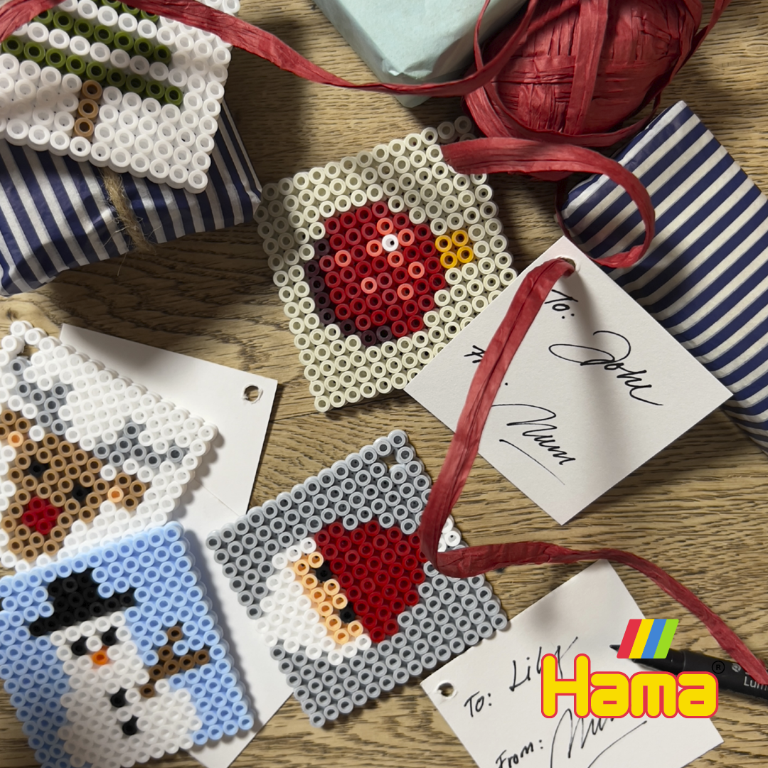 Små merkelapper laget av Hama-perler gir julegavene et sjarmerende og personlig preg. Motivene kan strykes flate eller beholdes med litt struktur, og festes enkelt med et bånd i toppen.